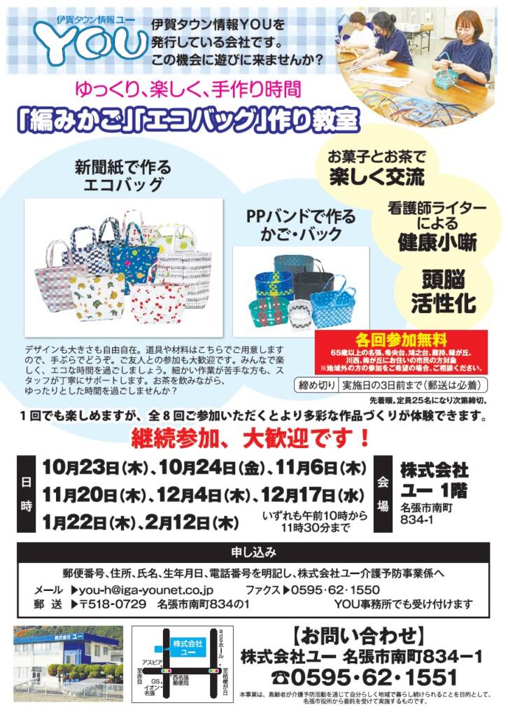 情報紙「伊賀タウン情報YOU」を発行する「ユー」(同市南町)が、市から一般介護予防事業の委託を受けて本社で実施。来年2月までに計8回の開催を予定しており、その初回と2回目だった。