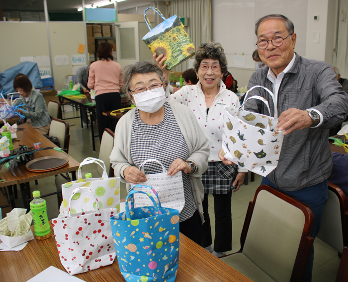 新聞紙のバッグにヒマワリの写真やサクランボのイラストをあしらった森志津さん(80)は「知らない人とも自然に会話ができて楽しかった。思っていた以上の出来に満足。次は友人も誘って参加したい」と話した。