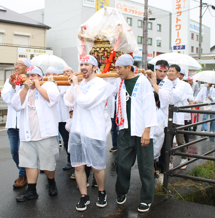 柳原町のみこしも、雨の中を進んだ。今年も外国人の参加者の姿があった。