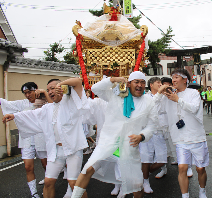 三重県名張市平尾の宇流冨志禰神社の秋季例大祭が10月26日、本祭を迎えた。雨で太鼓台やだんじりなどの集結行事は中止になったが、神社のみこしと一部の町のみこしが旧市街地を力強く練り歩いた。