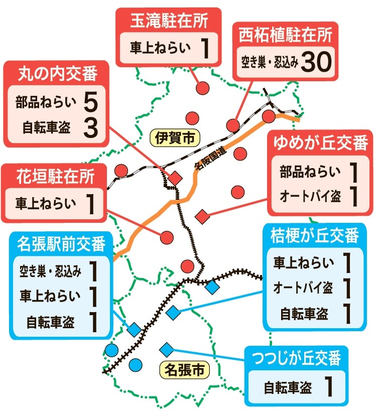 名張署では、侵入盗が1件(名張駅前)、自動車関連では車上ねらいが2件(名張駅前、桔梗が丘)、オートバイ盗が1件(桔梗が丘)あった。