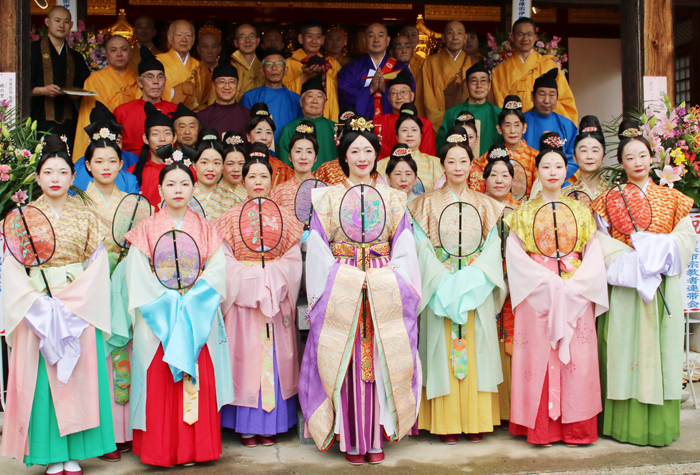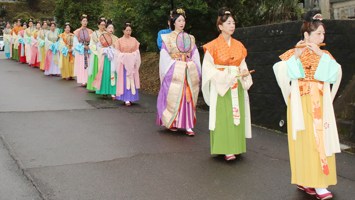 この日は、夏見廃寺と同型の塼仏が出土した奈良の唐招提寺の僧侶らも出席。男女約40人による色鮮やかな天平衣装行列に続き、法要では大小約700枚の金色に輝く塼仏が除幕された。その後、大来皇女に扮した男山みどりさん(48)が、新たに天武天皇の位牌と塼仏を作った事、世界平和や地域発展への願いなどを読み上げた。