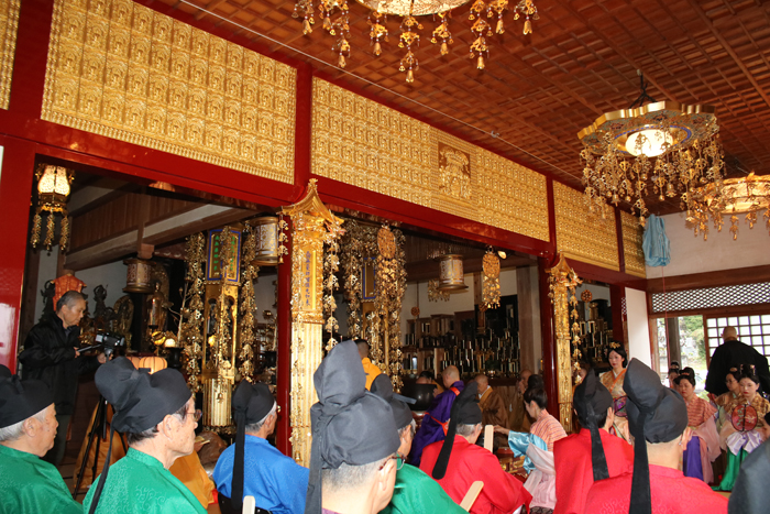 この日は、夏見廃寺と同型の塼仏が出土した奈良の唐招提寺の僧侶らも出席。男女約40人による色鮮やかな天平衣装行列に続き、法要では大小約700枚の金色に輝く塼仏が除幕された。その後、大来皇女に扮した男山みどりさん(48)が、新たに天武天皇の位牌と塼仏を作った事、世界平和や地域発展への願いなどを読み上げた。