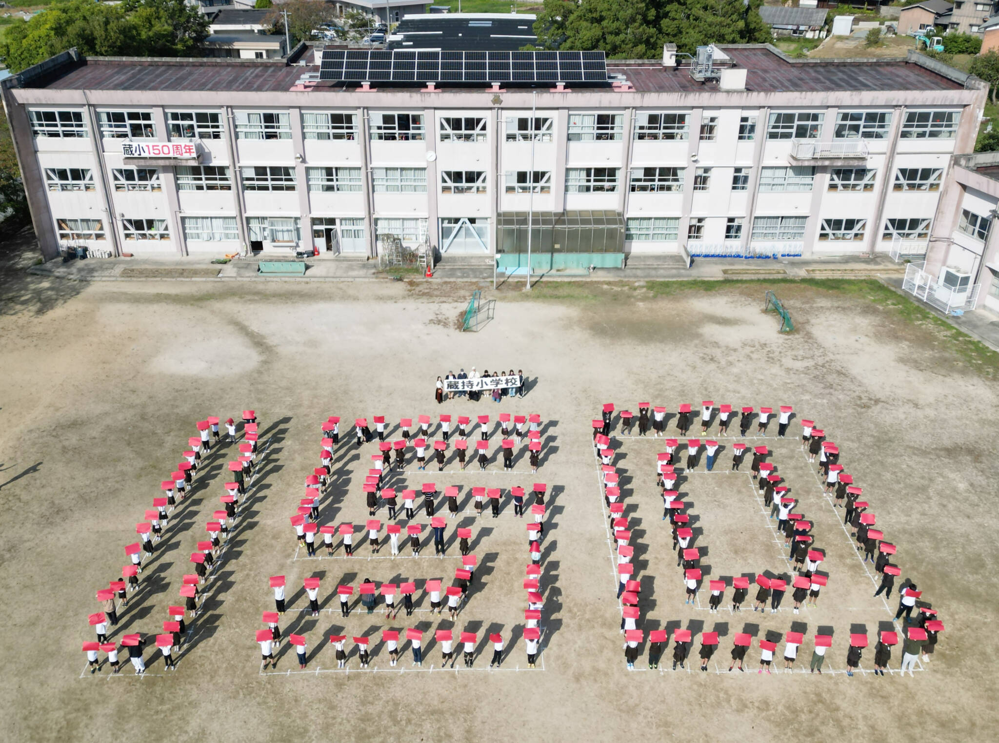 三重県名張市立蔵持小学校(蔵持町原出)で10月29日、創立150周年を記念したドローン撮影があった。全校児童や教職員、地域住民ら計約220人が校庭で大きな「150」の人文字を作り、節目を祝った。