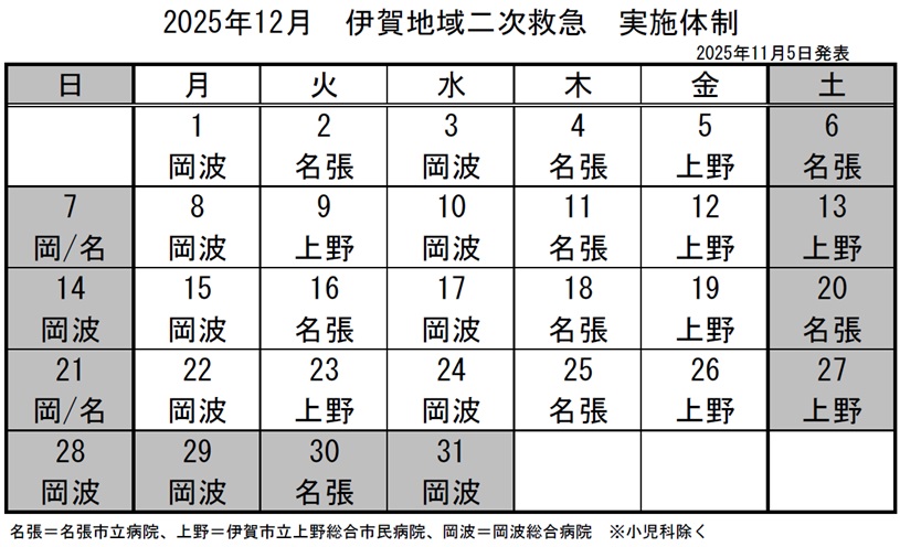 三重県の伊賀・名張両市は11月5日、伊賀市立上野総合市民と名張市立、岡波総合(伊賀市上之庄)の3病院による12月の時間外二次救急実施体制を発表した。