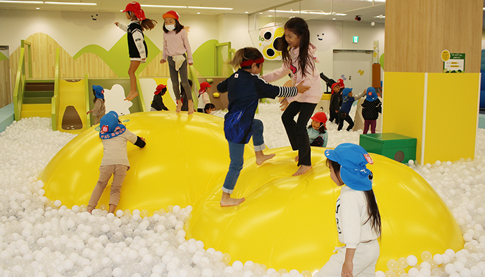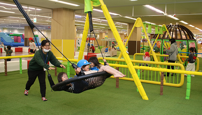 0歳から12歳の子どもと保護者が対象で、人工芝を敷き詰めた「ピクニックエリア」をはじめ、ボールプールや砂場、ブランコ、滑り台、カートなど多彩な遊具をそろえる。天候や季節に左右されず一日中遊べる上、飲食物の持ち込みや再入場も可能だ。