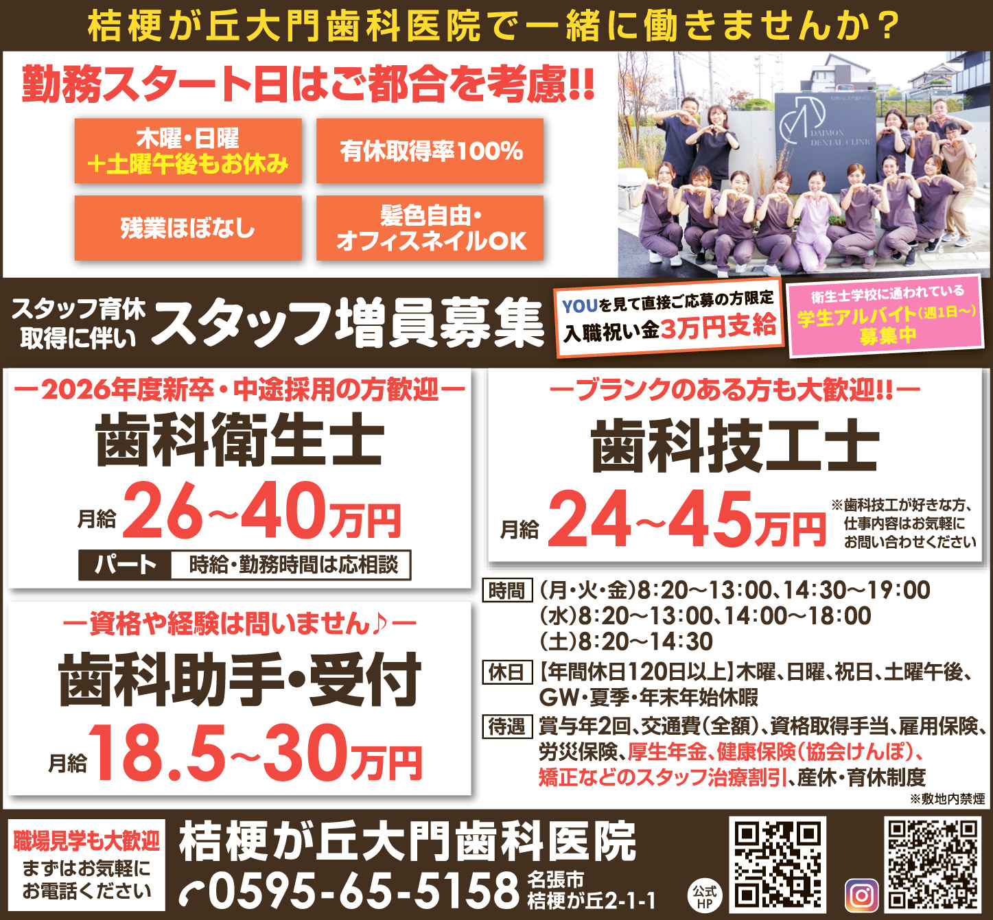 賞与年2回、交通費(全額)、資格取得手当、雇用保険、労災保険、厚生年金、健康保険(協会けんぽ)、矯正等スタッフ治療割引、産休・育休制度※敷地内禁煙