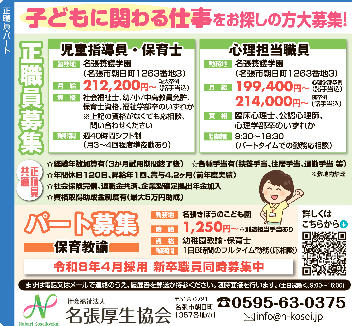 勤務地:名張養護学園・児童家庭支援センター「あかり」(名張市朝日町1263番地3)