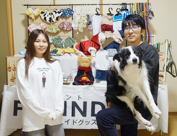 【愛犬とともにペット用の雑貨を紹介する木下さん夫妻=名張市緑が丘中で】