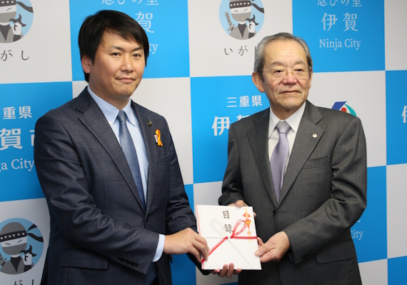【目録を手渡す田山会長(右)と稲森市長=伊賀市役所で】