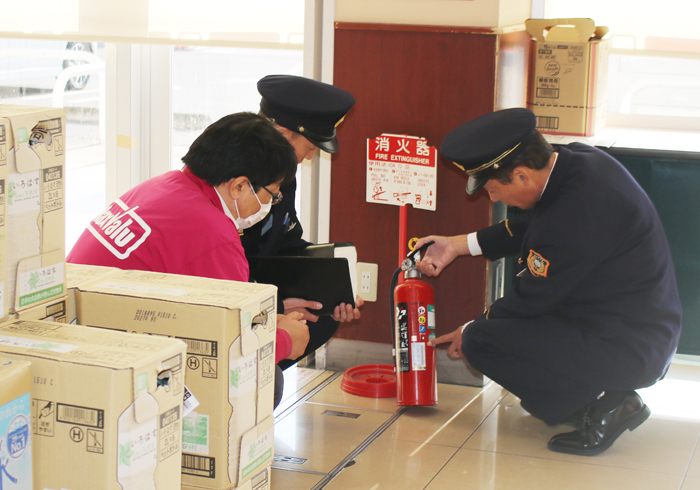 この日は、同本部予防室の担当者3人が同スーパーを訪問。防火シャッターの下に障害物が無いか、消火器や消火栓が適切に管理されているかなど、店内を見回って確認した。