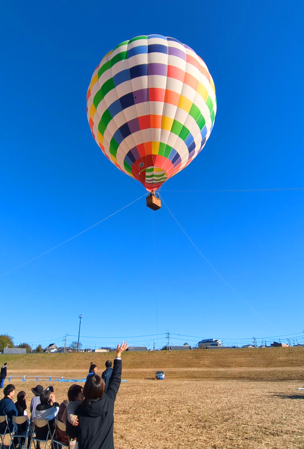 熱気球体験は、広大な遊水地を上空から感じてもらう試みで、津市の会社が運行。ロープで係留されたカラフルな熱気球に希望者が数人ずつ乗り込み、約25メートルの高さから遊水地や町並みを見渡した。