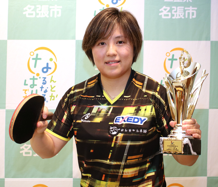「2025年全日本卓球選手権大会(マスターズの部)」女子サーティ(30歳以上)を制した三重県名張市の会社員、温崎馨さん(32)が12月22日、北川裕之市長を表敬訪問し、優勝を報告した。