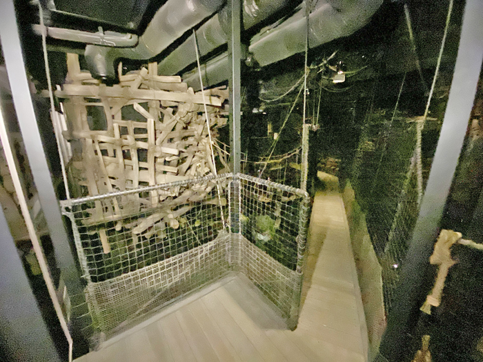 3階吹き抜けの暗闇の空間の中で、幅の狭い通路や揺れの大きいつり橋を進み、9か所のスポットでお札をタッチ。流れてくる音声で、忍びの教えを学ぶことができる。20分コースで大人(高校生以上)2000円、小人(小中学生)1500円。