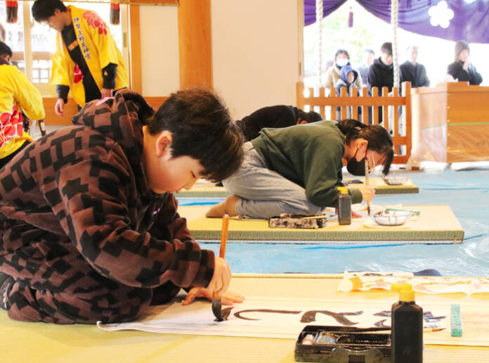 菅原神社氏子青年会(菅青会)の主催で、今年が47回目。参加者は厳かな空気に包まれた拝殿に入り、「おとし玉」「神前書ぞめ」「人類永遠平和」などの題に向き合い、一文字一文字を丁寧に書き上げた。