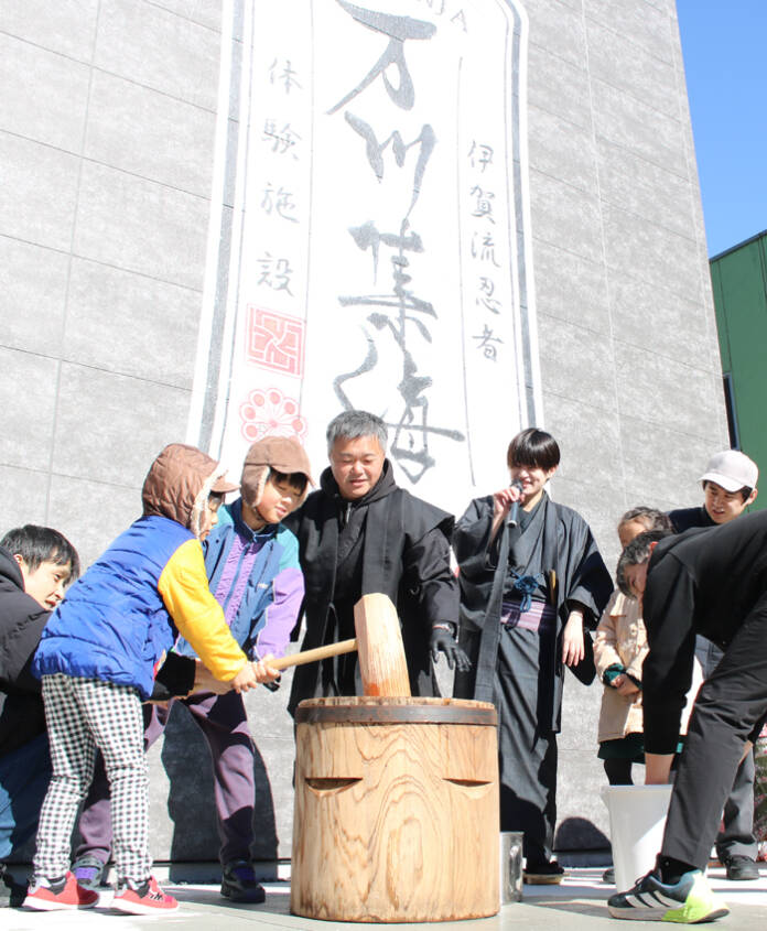 三重県伊賀市上野丸之内の伊賀流忍者体験施設「万川集海」で1月2日、「忍びのもちつき大会」が開かれた。大勢の家族連れらが参加し、つきたての餅を味わった。