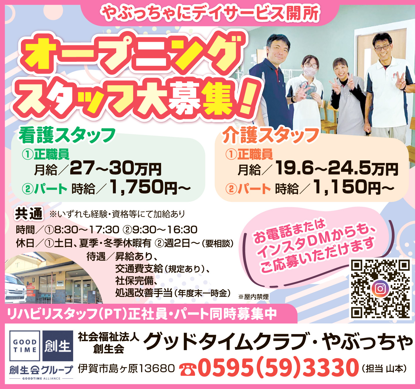 待遇/昇給あり、交通費支給(規定あり)、社保完備、処遇改善手当(年度末一時金)
