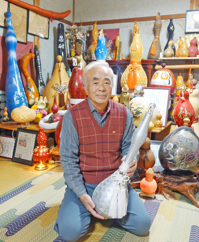高さ3センチから1メートル近い大小さまざまな実に模様を施すヒョウタン細工を楽しむ愛好家グループ「伊賀愛瓢会」の会長。全国組織「全日本愛瓢会」の展示会にも毎年出品し、入賞を重ねている。材料のヒョウタンは畑で栽培し、「1メートルを超すものを作りたい」と意気込む。
