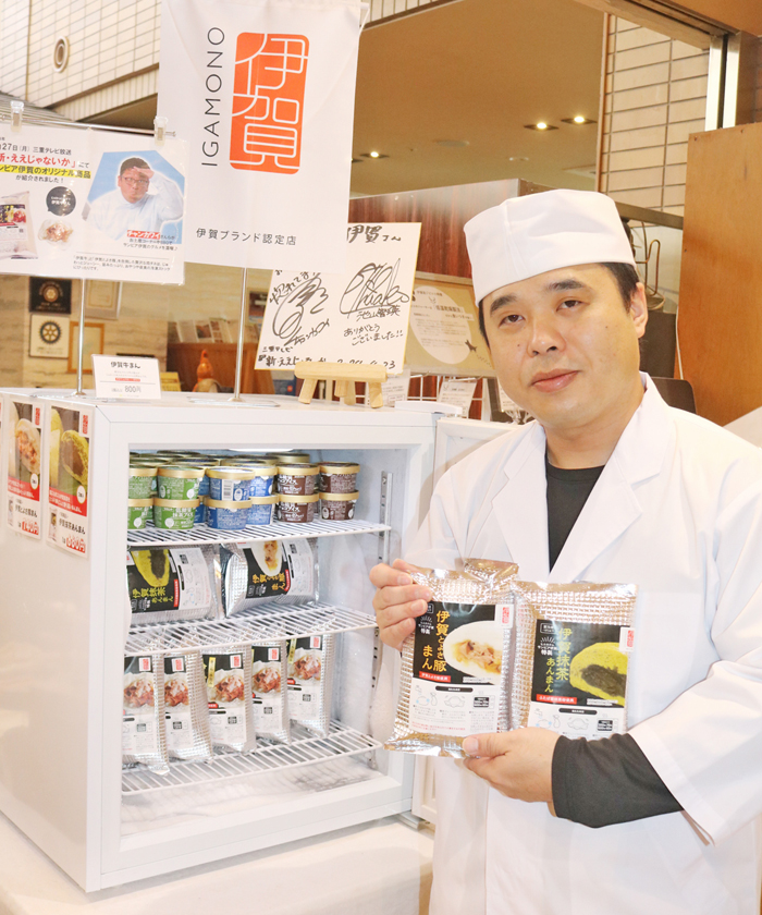 担当する調理部部長の割子田貴久さんは「既に発売している伊賀ブランド『伊賀牛まん』の姉妹商品で、伊賀の魅力を発信するアイテム。3商品にはそれぞれ種類の違う小麦粉を使っており、弾力やふわふわ感など生地の食感の違いを楽しみながらご賞味ください」と話している。