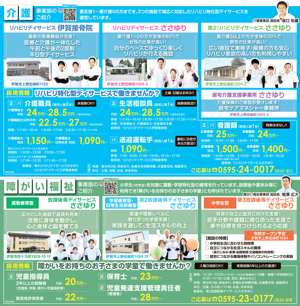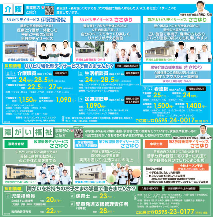 ホーム 求人情報 ささゆりグループ 求人情報正社員パート伊賀 ささゆりグループ 2026年1月23日 61 LINETwitterFacebookPinterest 紙面広告はこちらをクリック 応募方法まずは、お気軽にお電話ください♪ 応募・問合せ先介護事業部採用…0595-24-0017(担当/坂口)障がい福祉事業部採用…0595-23-0177(担当/相澤) - 広告 - 同じカテゴリーの記事 求人情報 社会福祉法人 名張育成会 求人情報 株式会社ユー 求人情報 フォスタービジネスサービス株式会社 求人情報All正社員契約社員派遣パートアルバイト伊賀名張その他の地域もっと 正社員募集!調理経験をセコムで活かしませんか <セコム株式会社 セコムHDセンター名張> 2026年1月9日 地元の企業やお店を、広告を通じて発信する「クリエイティブ」なお仕事です!<株式会社ユー> 2026年1月9日 2026年新しい仲間を大募集!正職員採用!!【放課後等デイサービスささゆり】 2026年1月9日 パート募集!食堂での調理補助のお仕事です <セコム株式会社> 2026年1月9日 ニュースAll総合事件・事故議会・行政紙面もっと 総合 民間の力で介護予防に新展開 赤目滝も舞台に 名張市 総合 地域安全で協定締結 伊賀署と伊賀上野ケーブルテレビ 紙面 将来の「夢」名張で見つけて 小学生向け仕事体験イベント 25日・アスピア 紙面 学んだ知識・技術を披露 伊賀白鳳高デザインコース卒展 24日から