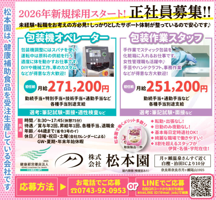 ホーム 求人情報 株式会社 松本園 求人情報正社員その他の地域 株式会社 松本園 2026年1月23日 44 LINETwitterFacebookPinterest 紙面広告はこちらをクリック 応募方法お電話またはLINE 応募・問合せ先①お電話/0743-92-0953②LINE/こちらをクリック - 広告 - 同じカテゴリーの記事 求人情報 ささゆりグループ 求人情報 社会福祉法人 名張育成会 求人情報 株式会社ユー 求人情報All正社員契約社員派遣パートアルバイト伊賀名張その他の地域もっと 2026年6月新規開院!オープニングスタッフ募集!!<あずまキッズ&アレルギークリニック> 2026年1月9日 伊賀の企業を元気に。まちをもっと面白く。令和8年4月1日採用 正職員募集<上野商工会議所> 2026年1月9日 デイ開所につき、オープニングスタッフ募集!! <グッドタイムクラブ・やぶっちゃ> 2026年1月9日 補聴器アドバイザー募集<三重県補聴器センター> 2026年1月9日 ニュースAll総合事件・事故議会・行政紙面もっと 総合 民間の力で介護予防に新展開 赤目滝も舞台に 名張市 総合 地域安全で協定締結 伊賀署と伊賀上野ケーブルテレビ 紙面 将来の「夢」名張で見つけて 小学生向け仕事体験イベント 25日・アスピア 紙面 学んだ知識・技術を披露 伊賀白鳳高デザインコース卒展 24日から
