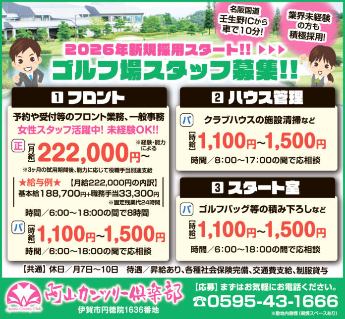 ホーム 求人情報 阿山カンツリー俱楽部 求人情報正社員パート伊賀 阿山カンツリー俱楽部 2026年1月23日 26 LINETwitterFacebookPinterest 紙面広告はこちら 応募方法まずは、お気軽にお電話ください。 応募・問合せ先0595-43-1666 - 広告 - 同じカテゴリーの記事 求人情報 ささゆりグループ 求人情報 社会福祉法人 名張育成会 求人情報 株式会社ユー 求人情報All正社員契約社員派遣パートアルバイト伊賀名張その他の地域もっと ささゆりグループ 2026年1月23日 伊賀の企業を元気に。まちをもっと面白く。令和8年4月1日採用 正職員募集<上野商工会議所> 2026年1月9日 福祉のお仕事 スタッフ大募集 <特別養護老人ホーム つつじの丘> 2026年1月9日 株式会社 問屋 北佐 2026年1月23日 ニュースAll総合事件・事故議会・行政紙面もっと 総合 民間の力で介護予防に新展開 赤目滝も舞台に 名張市 総合 地域安全で協定締結 伊賀署と伊賀上野ケーブルテレビ 紙面 将来の「夢」名張で見つけて 小学生向け仕事体験イベント 25日・アスピア 紙面 学んだ知識・技術を披露 伊賀白鳳高デザインコース卒展 24日から