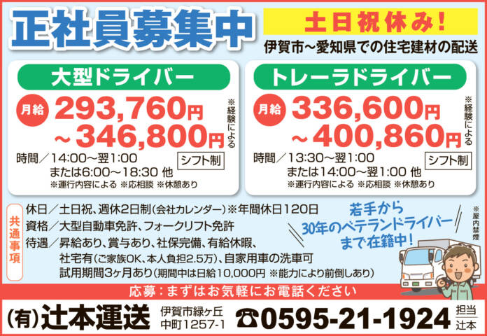 ホーム 求人情報 有限会社 辻本運送 求人情報正社員パート伊賀 有限会社 辻本運送 2026年1月23日 31 LINETwitterFacebookPinterest 紙面広告はこちらをクリック 応募方法まずはお気軽にお電話ください 応募・問合せ先0595-21-1924(担当:辻本) - 広告 - 同じカテゴリーの記事 求人情報 ささゆりグループ 求人情報 社会福祉法人 名張育成会 求人情報 株式会社ユー 求人情報All正社員契約社員派遣パートアルバイト伊賀名張その他の地域もっと パートさん募集! 簡単な工場内作業のお仕事です <清和工業株式会社 伊賀上野工場> 2026年1月9日 パート職員募集 <伊賀市文化都市協会> 2026年1月9日 株式会社ユー 2026年1月23日 株式会社ホットスタッフ伊賀 2026年1月23日 ニュースAll総合事件・事故議会・行政紙面もっと 紙面 リコーダーでプロと合奏 小学生の参加者募集 伊賀 総合 民間の力で介護予防に新展開 赤目滝も舞台に 名張市 総合 地域安全で協定締結 伊賀署と伊賀上野ケーブルテレビ 紙面 将来の「夢」名張で見つけて 小学生向け仕事体験イベント 25日・アスピア