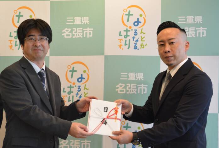 【出江副市長(左)に目録を手渡す坂本院長=名張市鴻之台で】