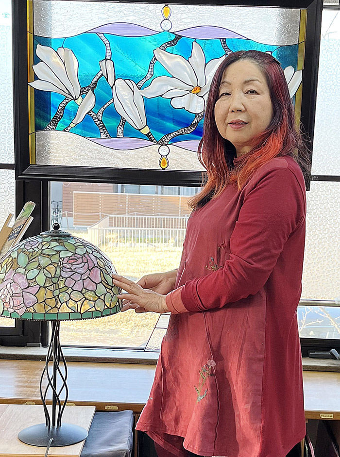 「光と色とが織り成す美しさは他に類を見ない。光を受けてきらめく輝きは格別で、気分も変わる」。ステンドグラス1級技能工芸士の資格を持ち、現在は三重県名張市外の教室も含め約35人にその魅力を伝えている。