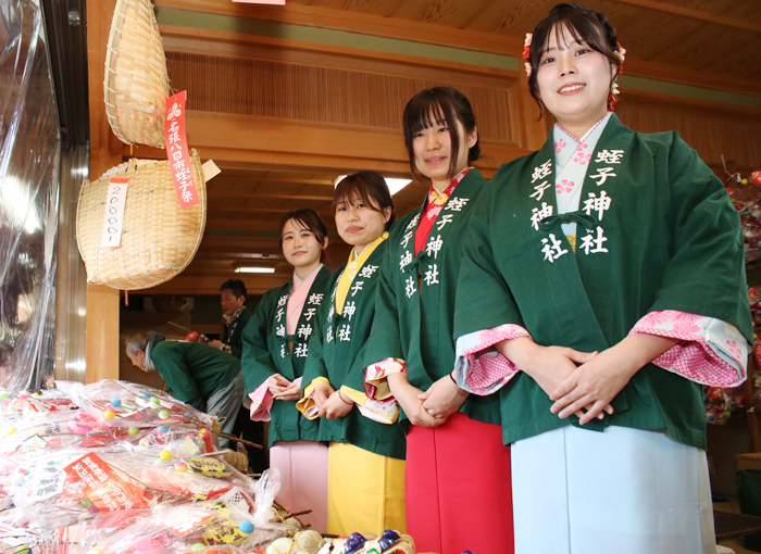 宵宮のこの日、福娘の立花幸奈さん(18)、新結奈さん(21)、永井里奈さん(22)、伊藤明寿美さん(27)が着物姿で登場し、ネコヤナギの枝に小判、米俵、タイなどを模した飾りを付けた「吉兆(けっきょ)」などを参拝客に手渡した。福娘の家族や友人らも訪れ、記念に写真を撮るなどしていた。