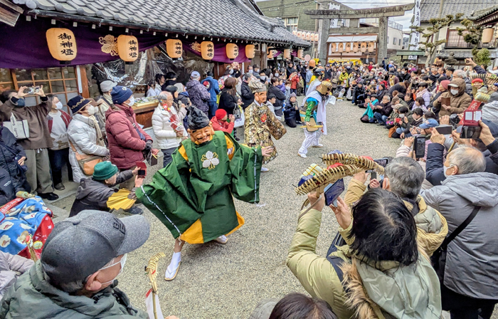神社前の通りにはいくつもの屋台が並び、にぎわいを見せた。近くの広場で行われたハマグリ入りかす汁の振る舞いは行列ができ、開始から40分ほどで予定していた約500杯を配り終えた。境内では七福神の舞の奉納もあり、多くの参拝客がカメラを向けていた。