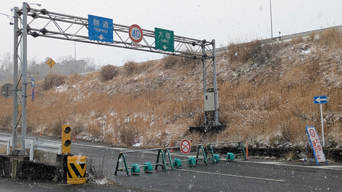 【バリケードが設置された上野東インター入り口=伊賀市四十九町で】