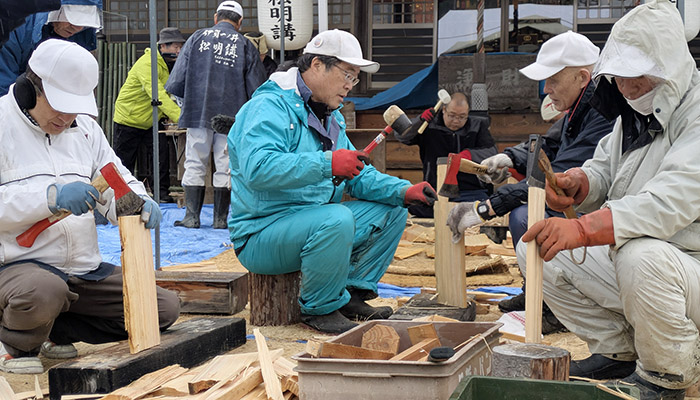 奈良・東大寺二月堂の修二会(お水取り)で使うたいまつを作る「松明調製」が2月11日、三重県名張市赤目町一ノ井の極楽寺(中川拓真住職)であった。地元住民でつくる伊賀一ノ井松明講の講員ら約100人が参加し、小雨が降る中、作業に励んだ。