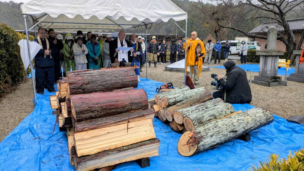 参加者は朝から寺近くの通称「松明山」に入り、樹齢約120年のヒノキ(高さ30メートル以上、幹の直径約40センチ)を伐採。丸太を切り分けてふもとまで運んだ。