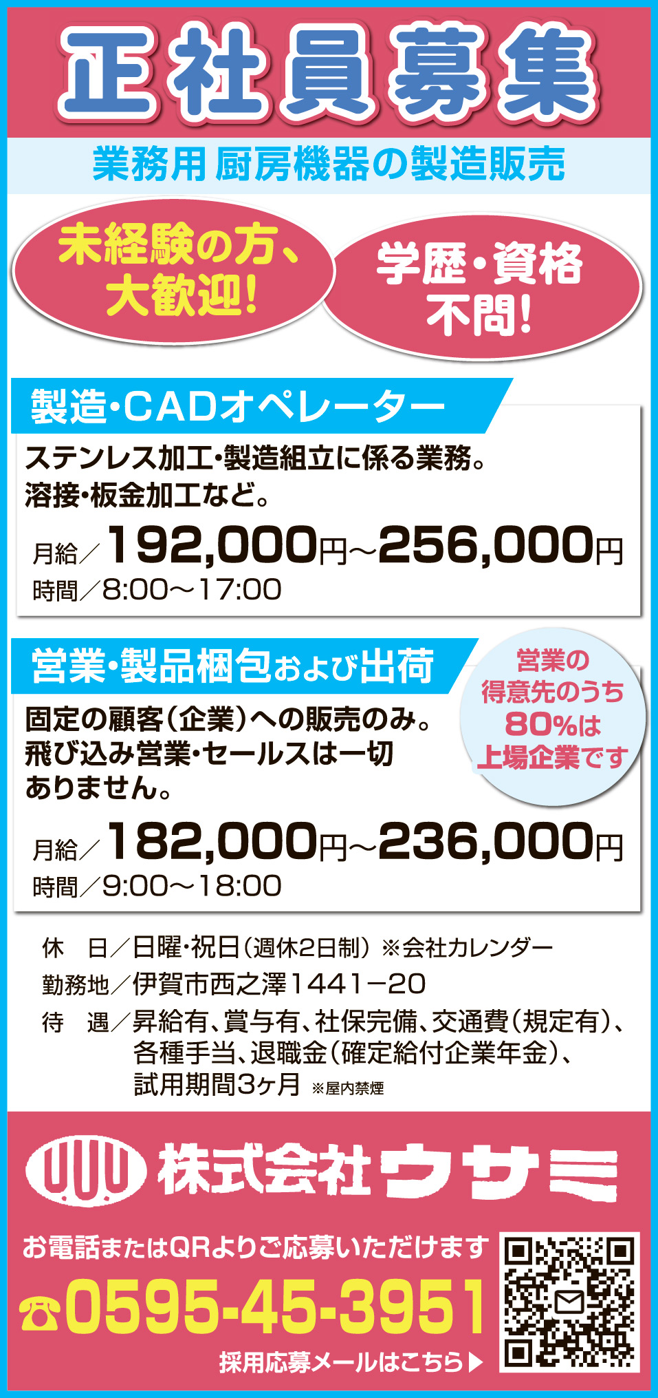 ホーム 求人情報 株式会社ウサミ 求人情報正社員伊賀 株式会社ウサミ 2026年2月13日 65 LINETwitterFacebookPinterest 紙面広告はこちらをクリック 応募方法 お電話またはメールフォームにてご応募ください 応募・問合せ先 電話応募:0595-45-3951メールフォームでの応募:https://qr.c-cloud.co.jp/t/e/keNyV8 - 広告 - 同じカテゴリーの記事 求人情報 株式会社ユー 求人情報 シダックス大新東ヒューマンサービス㈱近畿支店 滋賀営業所 求人情報 株式会社 建築の友 求人情報All正社員契約社員派遣パートアルバイトその他伊賀名張その他の地域もっと 有限会社 辻本運送 2026年1月23日 ABホテル株式会社 2026年1月23日 フォスタービジネスサービス株式会社 2026年1月23日 株式会社セイオー技研 2026年2月13日 ニュースAll総合事件・事故議会・行政紙面もっと 総合 春呼ぶ「修正会」 たいまつの火と水舞う結願法要 伊賀・島ヶ原 紙面 城下町彩る「おひなさん」 伊賀・上野本町通り周辺 3月3日まで 総合 3月14日にダイヤ変更 伊賀鉄道 紙面 「SRHR」学ぼう 14日に名張で講座