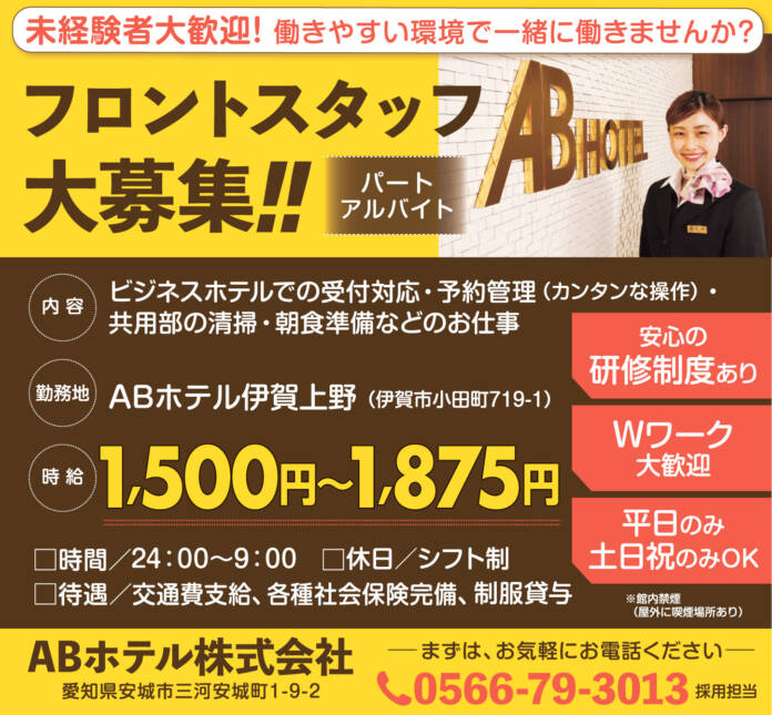 ホーム 求人情報 ABホテル株式会社 求人情報パートアルバイト伊賀 ABホテル株式会社 2026年2月13日 52 LINETwitterFacebookPinterest 紙面広告はこちらをクリック 応募方法まずは、お気軽にお電話ください。 応募・問合せ先ABホテル株式会社 愛知県安城市三河安城町1-9-2 0566-79-3013【採用担当】 - 広告 - 同じカテゴリーの記事 求人情報 株式会社ウサミ 求人情報 株式会社ユー 求人情報 シダックス大新東ヒューマンサービス㈱近畿支店 滋賀営業所 求人情報All正社員契約社員派遣パートアルバイトその他伊賀名張その他の地域もっと モリシマ商事 2026年1月23日 株式会社ユー 2026年1月23日 株式会社ホットスタッフ伊賀 2026年1月23日 名張かめい歯科・矯正歯科 2026年2月13日 ニュースAll総合事件・事故議会・行政紙面もっと 総合 春呼ぶ「修正会」 たいまつの火と水舞う結願法要 伊賀・島ヶ原 紙面 城下町彩る「おひなさん」 伊賀・上野本町通り周辺 3月3日まで 総合 3月14日にダイヤ変更 伊賀鉄道 紙面 「SRHR」学ぼう 14日に名張で講座
