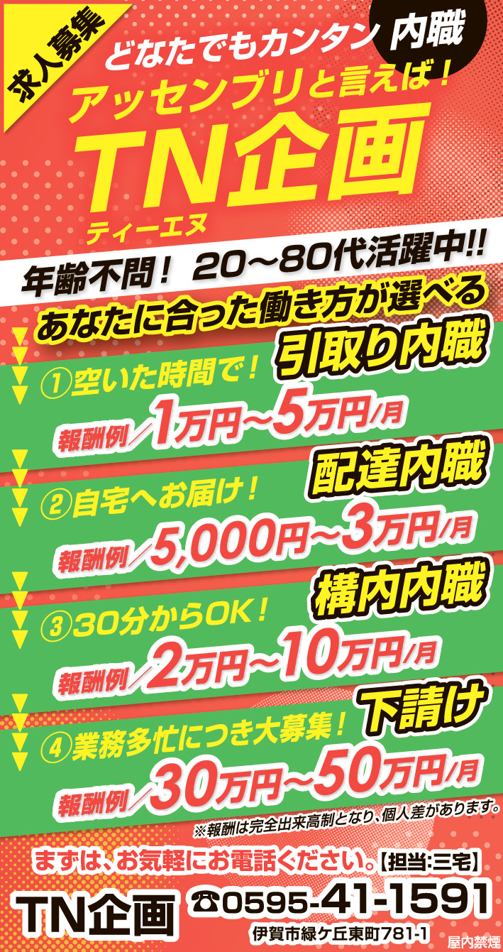 ホーム 求人情報 TN企画 求人情報その他伊賀名張 TN企画 2026年2月13日 26 LINETwitterFacebookPinterest 紙面広告はこちらをクリック 応募方法まずは、お気軽にお電話ください。 応募・問合せ先0595-41-1591 - 広告 - 同じカテゴリーの記事 求人情報 株式会社ウサミ 求人情報 株式会社ユー 求人情報 シダックス大新東ヒューマンサービス㈱近畿支店 滋賀営業所 求人情報All正社員契約社員派遣パートアルバイトその他伊賀名張その他の地域もっと 社会福祉法人 こもはら福祉会 はなの里 2026年2月13日 社会福祉法人 こもはら福祉会 はなの里 2026年1月23日 一般財団法人 信貴山病院分院 上野病院 2026年1月23日 株式会社 問屋 北佐 2026年1月23日 ニュースAll総合事件・事故議会・行政紙面もっと 総合 春呼ぶ「修正会」 たいまつの火と水舞う結願法要 伊賀・島ヶ原 紙面 城下町彩る「おひなさん」 伊賀・上野本町通り周辺 3月3日まで 総合 3月14日にダイヤ変更 伊賀鉄道 紙面 「SRHR」学ぼう 14日に名張で講座