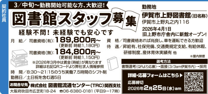 ホーム 求人情報 株式会社図書館流通センター 関西支社 求人情報契約社員伊賀 株式会社図書館流通センター 関西支社 2026年2月13日 34 LINETwitterFacebookPinterest 紙面広告はこちらをクリック 応募方法▼下記URLからご応募ください▼ 詳細・ 応募先https://trc-recruit.net/jobfind-pc/job/Tokai/38766 - 広告 - 同じカテゴリーの記事 求人情報 株式会社ウサミ 求人情報 株式会社ユー 求人情報 シダックス大新東ヒューマンサービス㈱近畿支店 滋賀営業所 求人情報All正社員契約社員派遣パートアルバイトその他伊賀名張その他の地域もっと 株式会社 大栄工業 2026年2月13日 一般財団法人 信貴山病院分院 上野病院 2026年1月23日 株式会社ホットスタッフ伊賀 2026年2月13日 モリシマ商事 2026年1月23日 ニュースAll総合事件・事故議会・行政紙面もっと 総合 春呼ぶ「修正会」 たいまつの火と水舞う結願法要 伊賀・島ヶ原 紙面 城下町彩る「おひなさん」 伊賀・上野本町通り周辺 3月3日まで 総合 3月14日にダイヤ変更 伊賀鉄道 紙面 「SRHR」学ぼう 14日に名張で講座