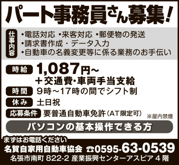 ホーム 求人情報 名賀自家用自動車協会 求人情報パート名張 名賀自家用自動車協会 2026年2月13日 30 LINETwitterFacebookPinterest 紙面広告はこちらをクリック 応募方法お気軽にお電話ください 応募・問合せ先0595-63-0539 - 広告 - 同じカテゴリーの記事 求人情報 株式会社ウサミ 求人情報 株式会社ユー 求人情報 シダックス大新東ヒューマンサービス㈱近畿支店 滋賀営業所 求人情報All正社員契約社員派遣パートアルバイトその他伊賀名張その他の地域もっと 名阪チサンカントリークラブ 2026年1月23日 株式会社ユー 2026年1月23日 シダックス大新東ヒューマンサービス㈱近畿支店 滋賀営業所 2026年2月13日 公益財団法人 伊賀市文化都市協会 2026年2月13日 ニュースAll総合事件・事故議会・行政紙面もっと 総合 春呼ぶ「修正会」 たいまつの火と水舞う結願法要 伊賀・島ヶ原 紙面 城下町彩る「おひなさん」 伊賀・上野本町通り周辺 3月3日まで 総合 3月14日にダイヤ変更 伊賀鉄道 紙面 「SRHR」学ぼう 14日に名張で講座