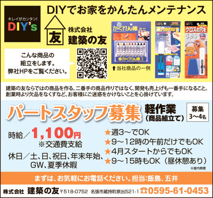 ホーム 求人情報 株式会社 建築の友 求人情報パート名張 株式会社 建築の友 2026年2月13日 58 LINETwitterFacebookPinterest 紙面広告はこちらをクリック 応募方法まずは、お気軽にお電話ください 応募・問合せ先0595-61-0453 - 広告 - 同じカテゴリーの記事 求人情報 株式会社ウサミ 求人情報 株式会社ユー 求人情報 シダックス大新東ヒューマンサービス㈱近畿支店 滋賀営業所 求人情報All正社員契約社員派遣パートアルバイトその他伊賀名張その他の地域もっと 社会福祉法人 名張育成会 2026年1月23日 ひだまり歯科 2026年2月13日 株式会社図書館流通センター 関西支社 2026年2月13日 ABホテル株式会社 2026年2月13日 ニュースAll総合事件・事故議会・行政紙面もっと 総合 春呼ぶ「修正会」 たいまつの火と水舞う結願法要 伊賀・島ヶ原 紙面 城下町彩る「おひなさん」 伊賀・上野本町通り周辺 3月3日まで 総合 3月14日にダイヤ変更 伊賀鉄道 紙面 「SRHR」学ぼう 14日に名張で講座