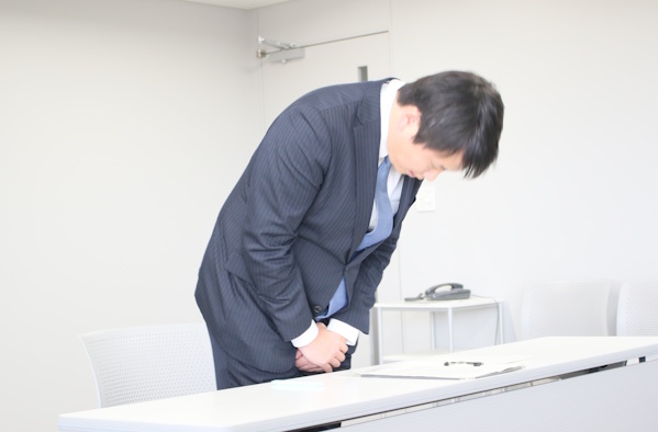 【記者会見で頭を下げる稲森市長=伊賀市役所で】