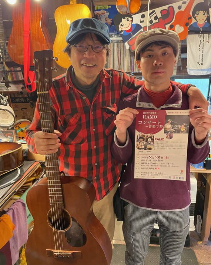 「RAMO」は、松阪市の垣内大徳さん(63)、長男の楽守さん(31)による音楽ユニット。小学5年の時、自閉症から、孤立して他人を怖がってしまう「二次障がい」が生じた楽守さんに「音楽の力で克服してもらえたら」との思いで、17年前に活動を始めた。