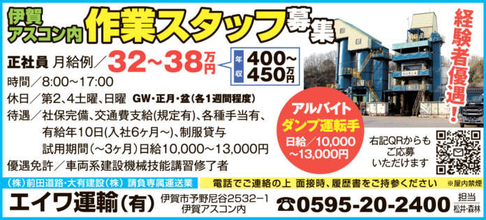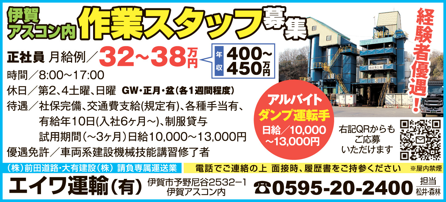 ホーム 求人情報 有限会社エイワ運輸 求人情報正社員アルバイト伊賀 有限会社エイワ運輸 2026年2月27日 73 LINETwitterFacebookPinterest 紙面広告はこちらをクリック 雇用形態正社員・アルバイト 応募方法画像のQRまたはお電話にてご応募ください 応募・問合せ先0595-20-2400(担当/松井・森林) - 広告 - 同じカテゴリーの記事 求人情報 ZACROS株式会社 名張事業所 求人情報 美容室 pele+bro(ペレ・ブロー) 求人情報 社会福祉法人 名張厚生協会 求人情報All正社員契約社員派遣パートアルバイトその他伊賀名張その他の地域もっと 名賀自家用自動車協会 2026年2月13日 名張商工会議所 2026年2月27日 株式会社ウサミ 2026年2月13日 社会福祉法人 明光会 2026年2月27日 ニュースAll総合事件・事故議会・行政紙面もっと 紙面 改めて知る画家・濵邉萬吉の世界 遺作展27日から 伊賀市のギャラリーで 議会・行政 名張市、中学校給食29年9月開始目標 小学校もセンター集約方針 議会・行政 施政・予算編成方針「持続可能なまちづくり着実に」 稲森・伊賀市長 議会・行政 3月定例議会始まる 名張市議会