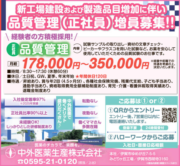 ホーム 求人情報 中外医薬生産株式会社 求人情報正社員伊賀 中外医薬生産株式会社 2026年2月27日 43 LINETwitterFacebookPinterest 紙面広告はこちらをクリック 雇用形態正社員 勤務地本社/伊賀市ゆめが丘7-5-5みどりヶ丘工場/伊賀市西明寺3160 応募方法①応募フォームからご応募②ハローワークからご応募 問合せ先0595-21-0120(担当/上出) - 広告 - 同じカテゴリーの記事 求人情報 有限会社エイワ運輸 求人情報 ZACROS株式会社 名張事業所 求人情報 美容室 pele+bro(ペレ・ブロー) 求人情報All正社員契約社員派遣パートアルバイトその他伊賀名張その他の地域もっと 日化メンテナンス株式会社 2026年2月27日 ヘルパーステーションそよ風 2026年2月27日 阿山カンツリー俱楽部 2026年2月13日 名賀自家用自動車協会 2026年2月13日 ニュースAll総合事件・事故議会・行政紙面もっと 紙面 改めて知る画家・濵邉萬吉の世界 遺作展27日から 伊賀市のギャラリーで 議会・行政 名張市、中学校給食29年9月開始目標 小学校もセンター集約方針 議会・行政 施政・予算編成方針「持続可能なまちづくり着実に」 稲森・伊賀市長 議会・行政 3月定例議会始まる 名張市議会