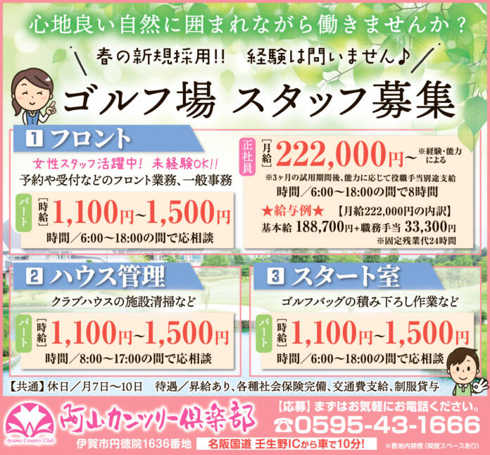 ホーム 求人情報 阿山カンツリー俱楽部 求人情報正社員パート伊賀 阿山カンツリー俱楽部 2026年2月27日 38 LINETwitterFacebookPinterest 紙面広告はこちら 雇用形態正社員・パート 応募方法まずは、お気軽にお電話ください。 応募・問合せ先0595-43-1666 - 広告 - 同じカテゴリーの記事 求人情報 有限会社エイワ運輸 求人情報 ZACROS株式会社 名張事業所 求人情報 美容室 pele+bro(ペレ・ブロー) 求人情報All正社員契約社員派遣パートアルバイトその他伊賀名張その他の地域もっと 株式会社セイオー技研 2026年2月13日 ZACROS株式会社 名張事業所 2026年2月27日 株式会社図書館流通センター 関西支社 2026年2月13日 中外医薬生産株式会社 2026年2月27日 ニュースAll総合事件・事故議会・行政紙面もっと 紙面 改めて知る画家・濵邉萬吉の世界 遺作展27日から 伊賀市のギャラリーで 議会・行政 名張市、中学校給食29年9月開始目標 小学校もセンター集約方針 議会・行政 施政・予算編成方針「持続可能なまちづくり着実に」 稲森・伊賀市長 議会・行政 3月定例議会始まる 名張市議会