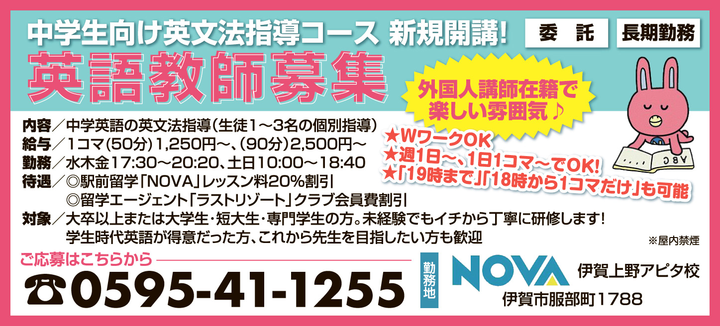 ホーム 求人情報 NOVA伊賀上野アピタ校 求人情報その他伊賀 NOVA伊賀上野アピタ校 2026年2月27日 27 LINETwitterFacebookPinterest 紙面広告はこちらをクリック 雇用形態その他 応募方法まずはお気軽にお電話にてご応募ください 応募・問合せ先0595-41-1255 - 広告 - 同じカテゴリーの記事 求人情報 有限会社エイワ運輸 求人情報 ZACROS株式会社 名張事業所 求人情報 美容室 pele+bro(ペレ・ブロー) 求人情報All正社員契約社員派遣パートアルバイトその他伊賀名張その他の地域もっと 株式会社ユー 2026年2月13日 社会福祉法人 名張厚生協会 2026年2月27日 株式会社 大栄工業 2026年2月13日 美容室 pele+bro(ペレ・ブロー) 2026年2月27日 ニュースAll総合事件・事故議会・行政紙面もっと 紙面 改めて知る画家・濵邉萬吉の世界 遺作展27日から 伊賀市のギャラリーで 議会・行政 名張市、中学校給食29年9月開始目標 小学校もセンター集約方針 議会・行政 施政・予算編成方針「持続可能なまちづくり着実に」 稲森・伊賀市長 議会・行政 3月定例議会始まる 名張市議会