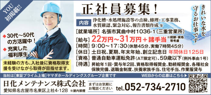 ホーム 求人情報 日化メンテナンス株式会社 求人情報正社員名張 日化メンテナンス株式会社 2026年2月27日 26 LINETwitterFacebookPinterest 紙面広告はこちらをクリック 雇用形態正社員 応募方法お電話または下記URLよりご応募ください 応募・問合せ先①052-734-2710②こちらをクリック - 広告 - 同じカテゴリーの記事 求人情報 有限会社エイワ運輸 求人情報 ZACROS株式会社 名張事業所 求人情報 美容室 pele+bro(ペレ・ブロー) 求人情報All正社員契約社員派遣パートアルバイトその他伊賀名張その他の地域もっと セコム株式会社 セコムHDセンター名張 2026年2月27日 名賀自家用自動車協会 2026年2月13日 株式会社ホットスタッフ伊賀 2026年2月27日 株式会社ユー 2026年2月13日 ニュースAll総合事件・事故議会・行政紙面もっと 紙面 改めて知る画家・濵邉萬吉の世界 遺作展27日から 伊賀市のギャラリーで 議会・行政 名張市、中学校給食29年9月開始目標 小学校もセンター集約方針 議会・行政 施政・予算編成方針「持続可能なまちづくり着実に」 稲森・伊賀市長 議会・行政 3月定例議会始まる 名張市議会
