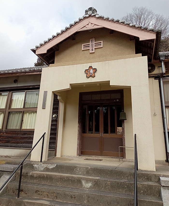 【旧博要小学校の玄関。扉の右に校鐘が写っている(2022年2月撮影)】