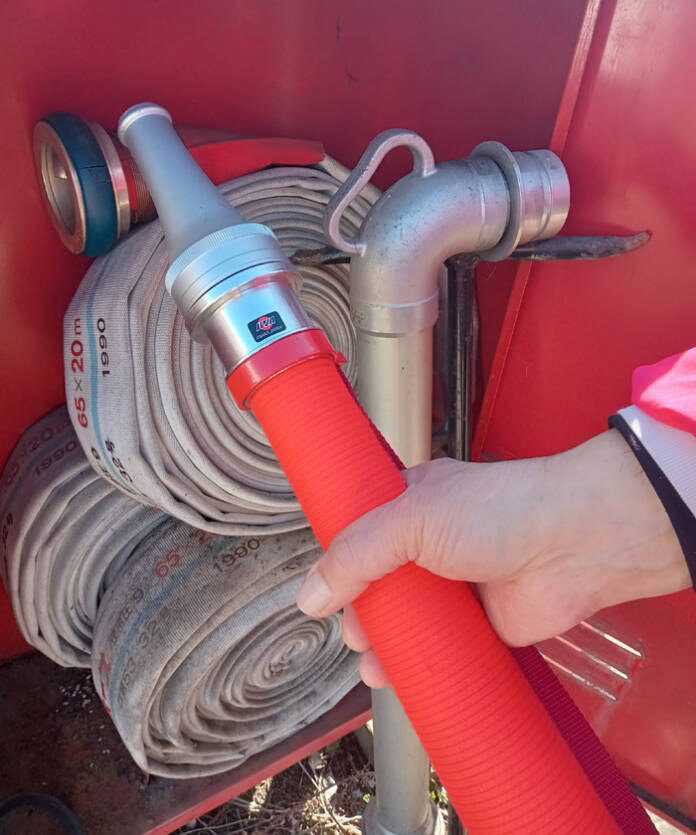 【赤い格納箱に収納されている管鎗やホースなど=伊賀市で】