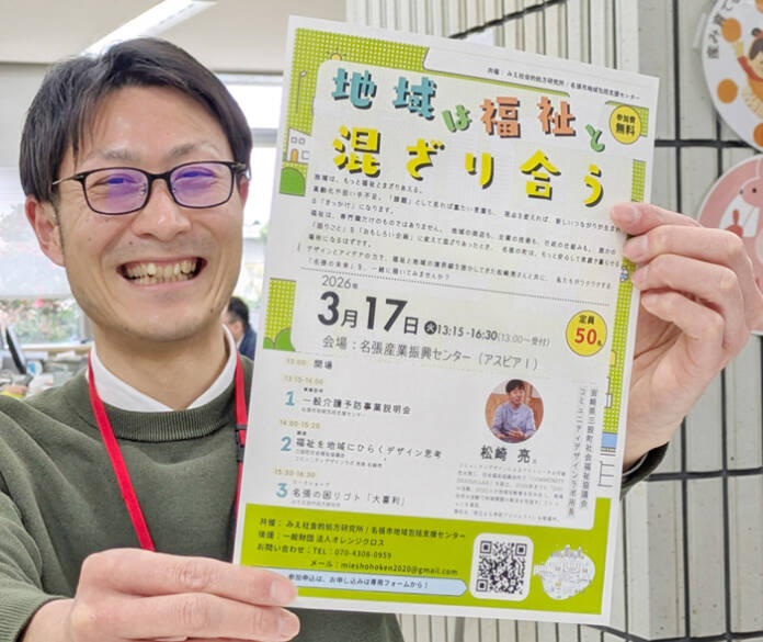 みえ社会的処方研究所と市地域包括支援センターの共催。コミュニティデザインラボ所長の松崎亮さん(宮崎県三股町社会福祉協議会)が「福祉を地域にひらくデザイン思考」をテーマに講演する他、「名張の困りゴト『大喜利』」と題したワークショップや市の一般介護予防事業説明会がある。終了は同4時30分の予定。